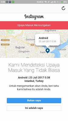 Pada gambar di atas adalah sebuah verifikasi yang timbul pada saat kita login, di mana saat kita memasukkan id dan password instagram pada situs akan timbul tulisan merah yang arti nya kita disuruh membuka instagram untuk memverifikasi lokasi dimana kita login, silahkan sobat klik "Ini Adalah Saya" kemudian kembali ke situs auto follower tadi kemudian masukkan kembali id dan password sobat dan barulah bisa login.